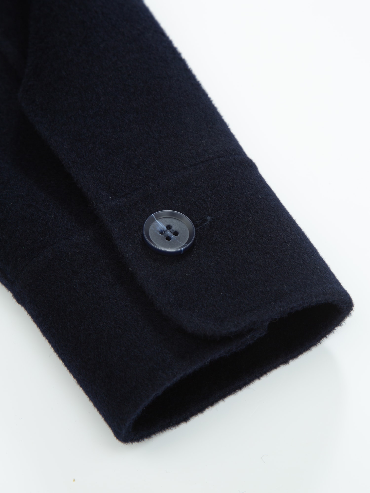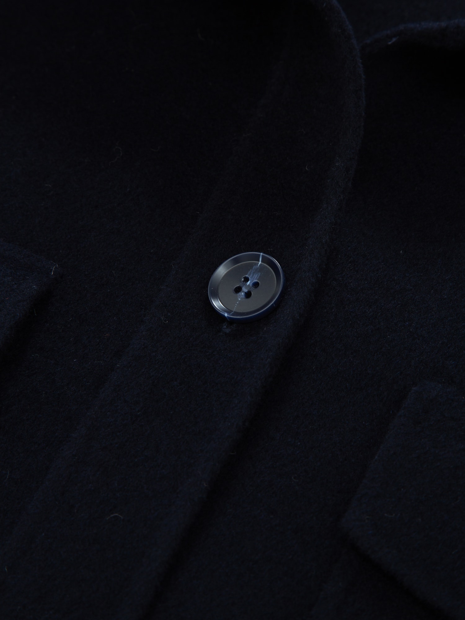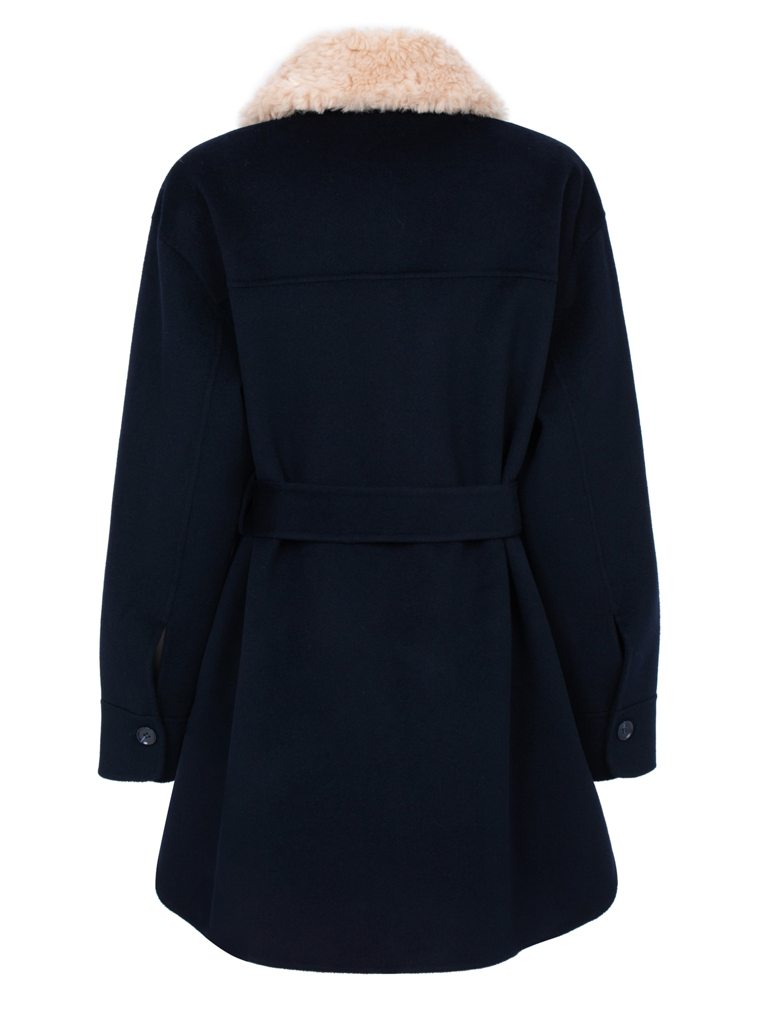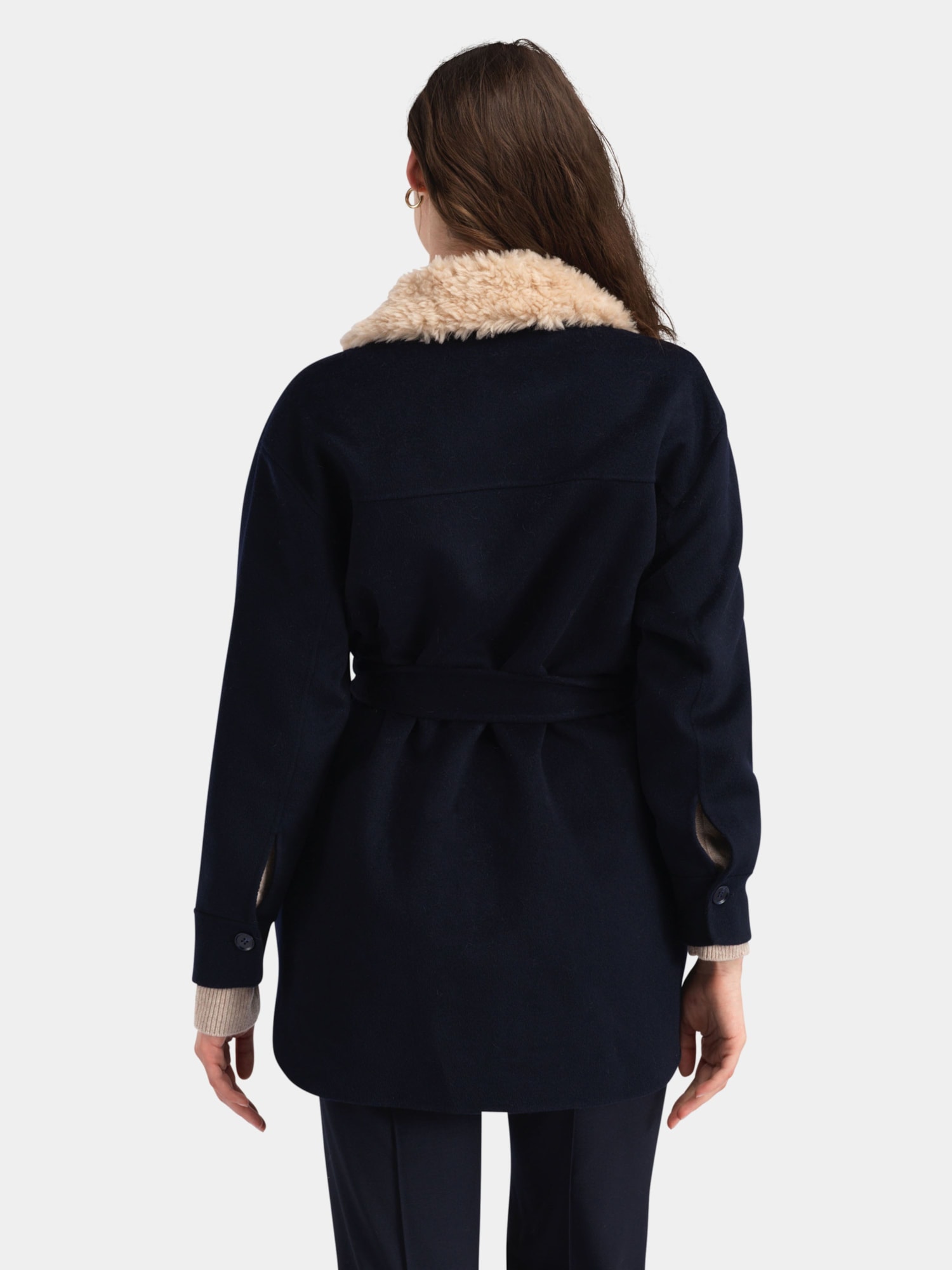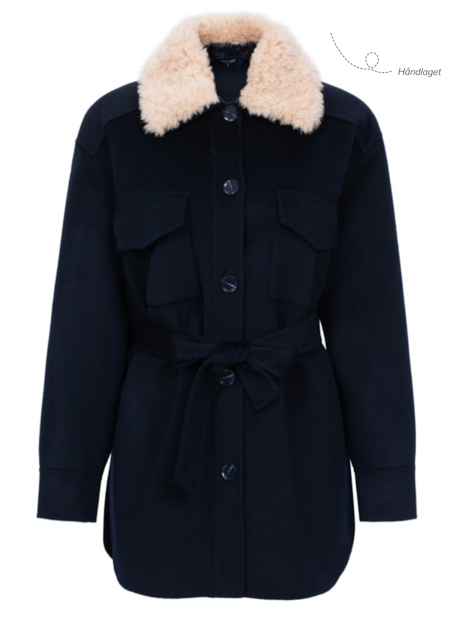 Skålatårnet Jacket is an elegant outerwear piece for women, designed with the silhouette of a shirt. It is crafted from a luxurious blend of 90% merino wool and 10% cashmere for optimal warmth and comfort. The jacket features a waist belt and both chest and side pockets, combining functionality with a refined look. It also comes with a detachable shearling collar made from 100% lambswool, offering extra warmth and a stylish finish.